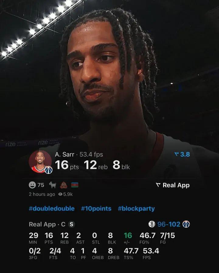 全场15中7砍下16分12篮板2助攻8封盖,封盖数创夏联历史最高记录。